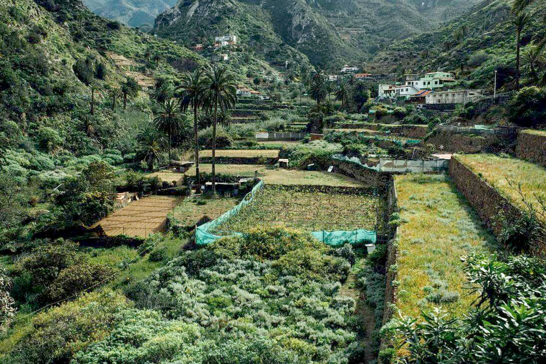 cultivos hortofrutícolas, viña, papas y ñames, en una serie de bancales de