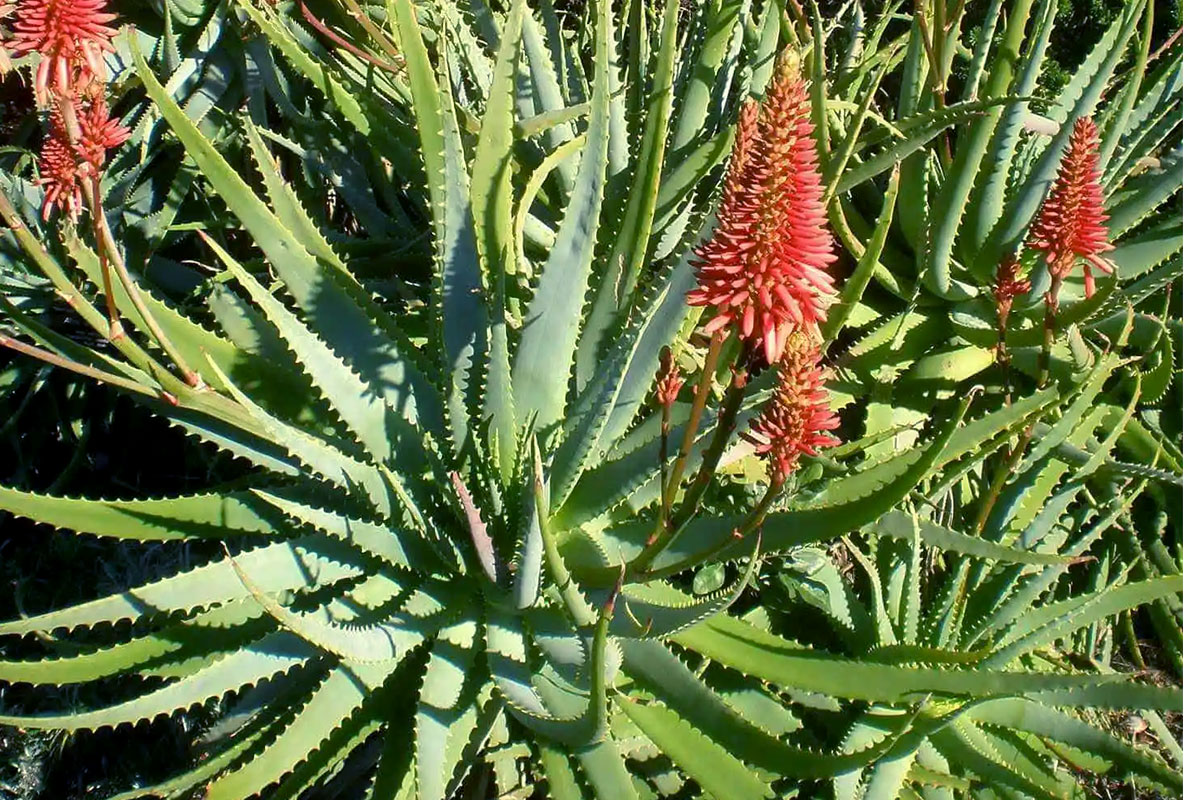 Las hojas son de color verde glauco, ensiformes, carnosas y con el