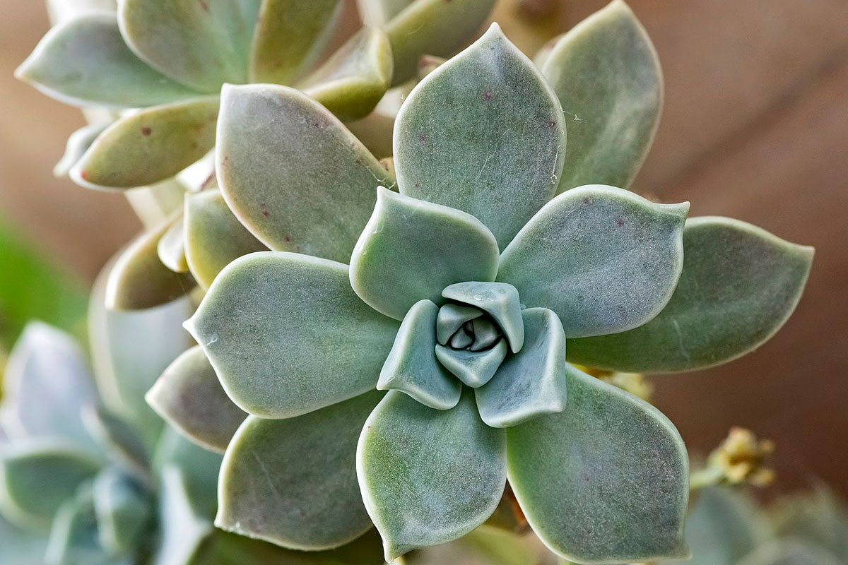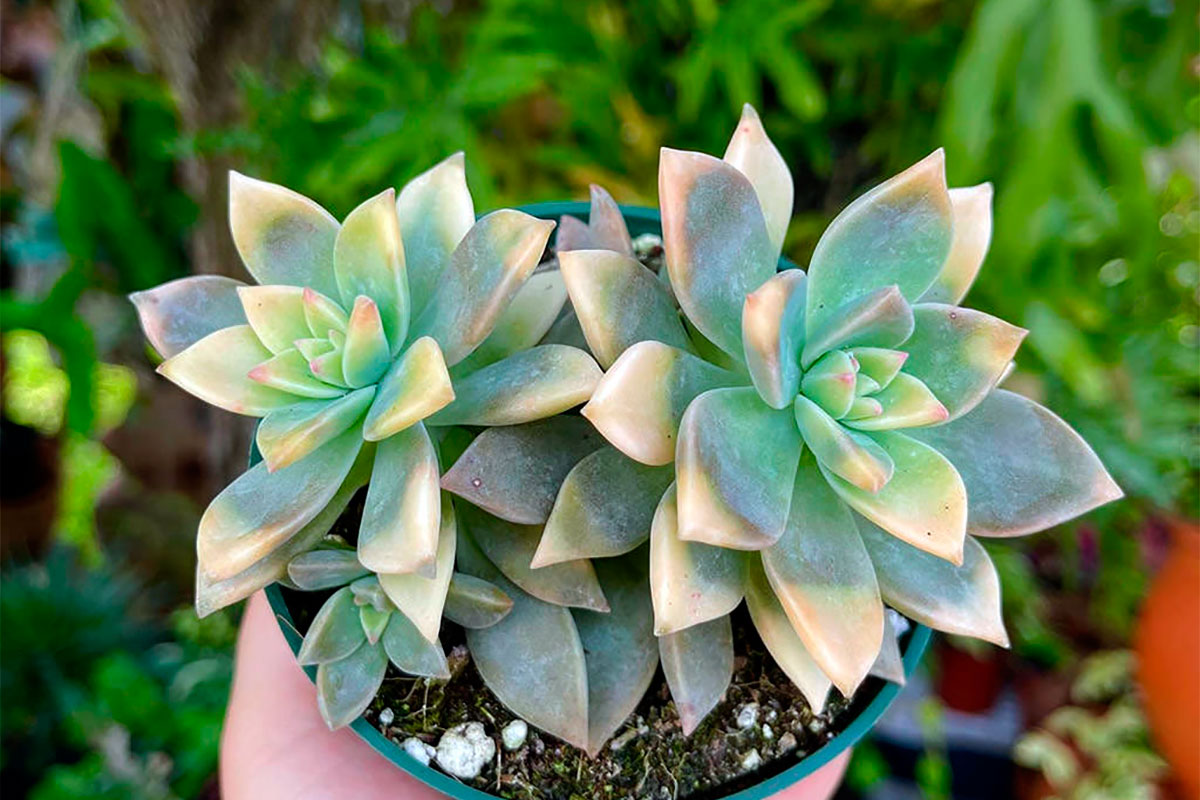 Esta suculenta destaca por sus hojas dispuestas en forma de roseta. No